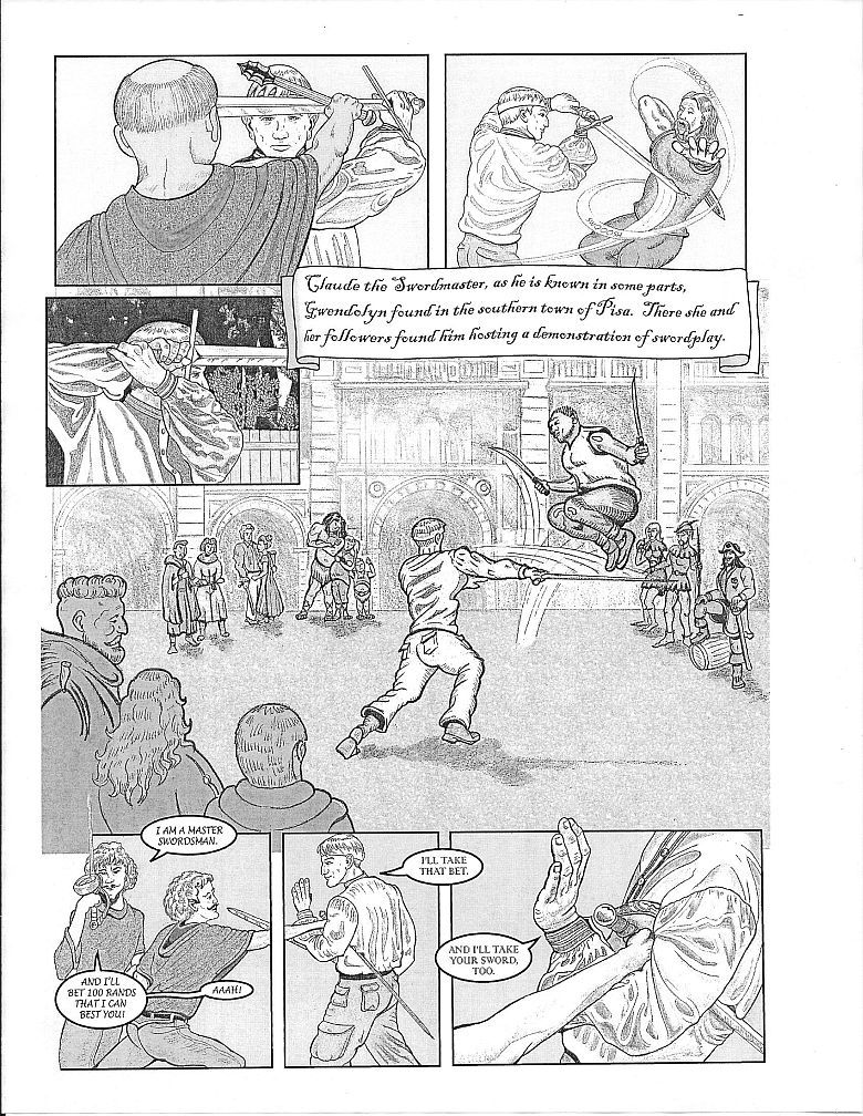Page 8. Claude the Calabresian Swordmaster. Easily the most complicated character of the entire Troupe, Claude seems like he should be one dimensional, but he is like a Parfait -- layer upon layer upon layer. The sword moves [all real] were staged by Leslie's friend Russ. That was me as the Elf getting my sword taken away after a quick lunge from 6th position. The man is incredibly fast. Thanks, Russ, for making me look like an idiot -- although it did work well in the storyline, so we used it. Note the playful jokes in the background of the central picture. -- Robert Stradley and Leslie Dubiel-Stradley - Weekend Artists. |