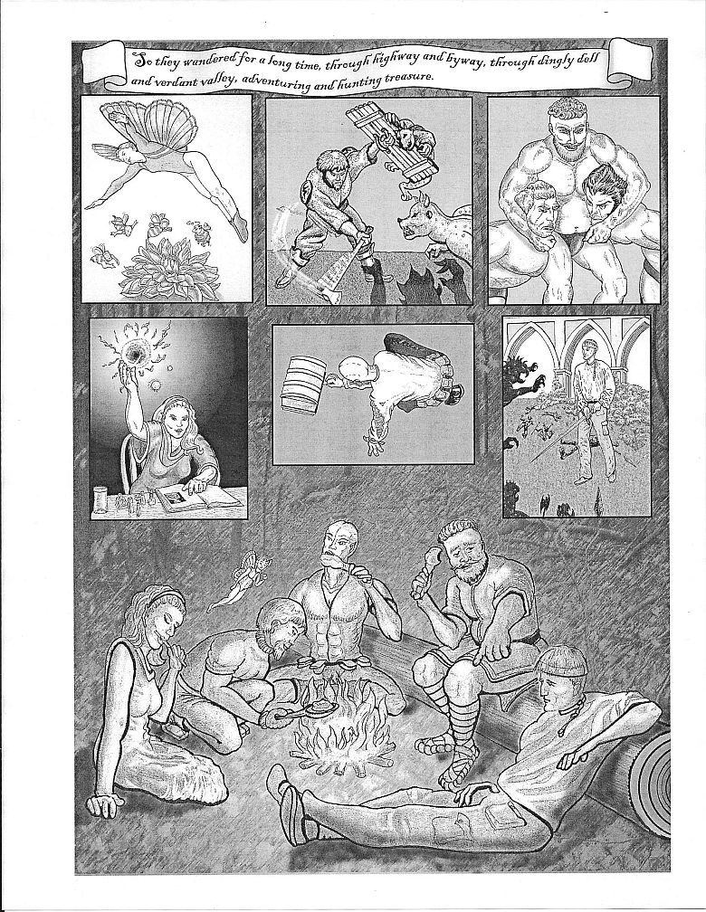 Page 11. They wandered thru dingly dell and verdant valley. Here is the obligatory group scene around the campfire, but someone isn't a happy camper. Note the vignettes of each character. There are important clues embedded in each picture. -- Robert Stradley and Leslie Dubiel-Stradley - Weekend Artists. |