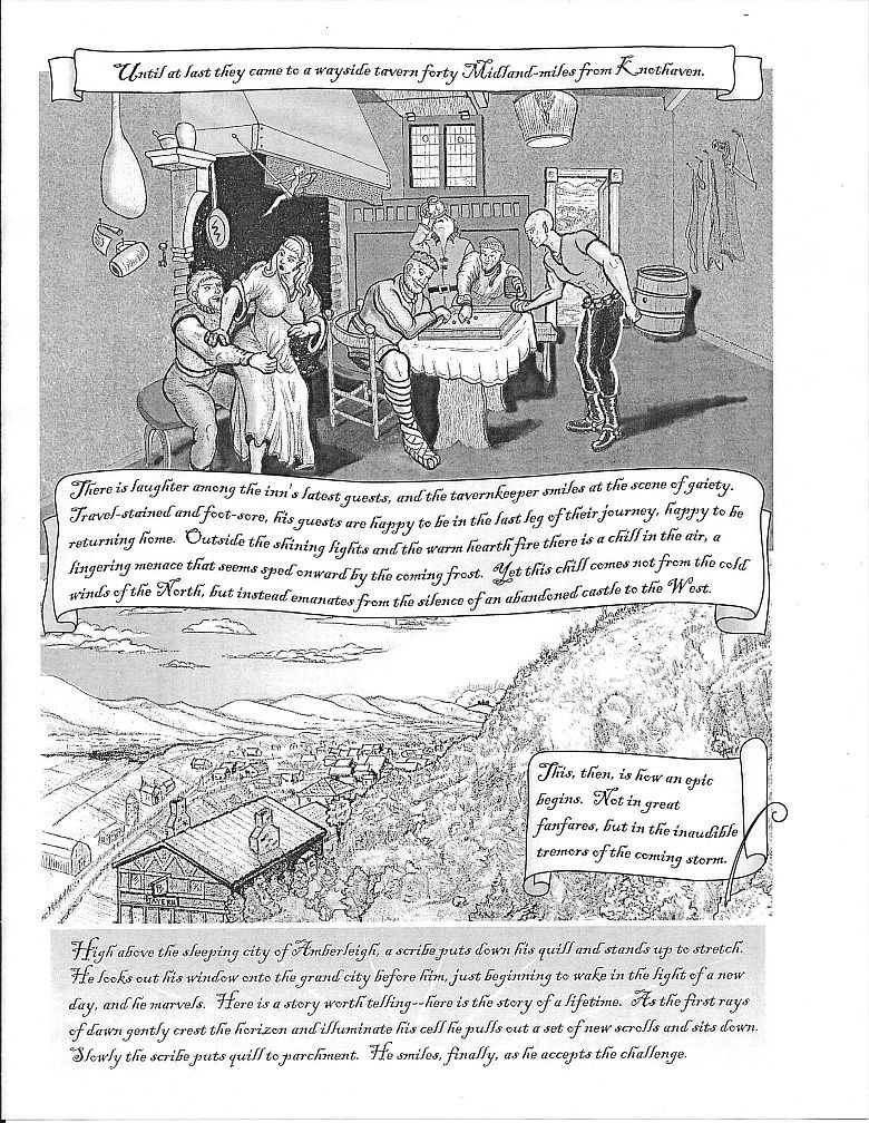 Page 12. The Prelude wrap up and the hook for the series - a coming storm and the chill of Evil Magie. Again the fourth wall is broken but also woven into the storyline. If we do it correctly, it will become a story within a story -- a favorite device of stage performances from Shakespear's time on. Note what the Pixie is doing for fun and what Rolfe thinks about just sitting quietly. Is that the Scribe without a name quaffing in the background? The wayside inn is a reference to a famous painting. Does anyone recognize it? Yes, we've loaded more than our fair share of references in this initial volume, but we were having fun with the concept and wanted to make it fun for the informed reader. Good Hunting. -- Robert Stradley and Leslie Dubiel-Stradley - Weekend Artists. |
